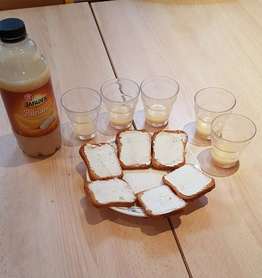 Collation: nectare de bananes, biscotte, fromage à tartiner