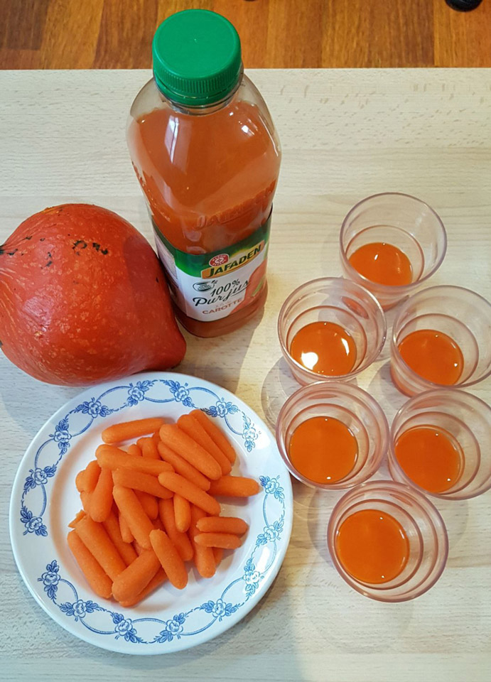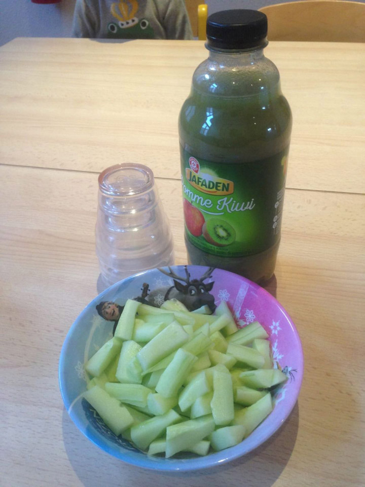Collation: Jus pomme/kiwi, bâtonnets de concombre