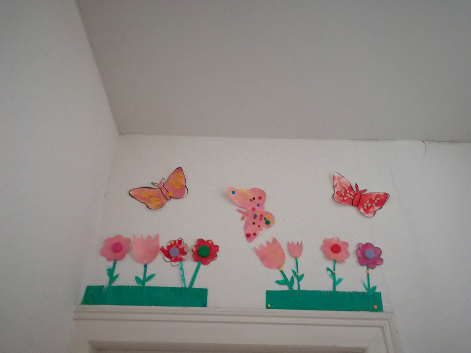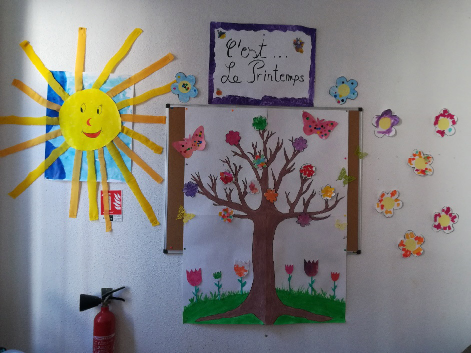 Nous avons opté pour une fresque printanière. Les enfants ont peint plusieurs formats de fleurs, papillons afin de découvrir les couleurs et les différentes matières ( papier crêpon , gommettes , haricots blanc...).